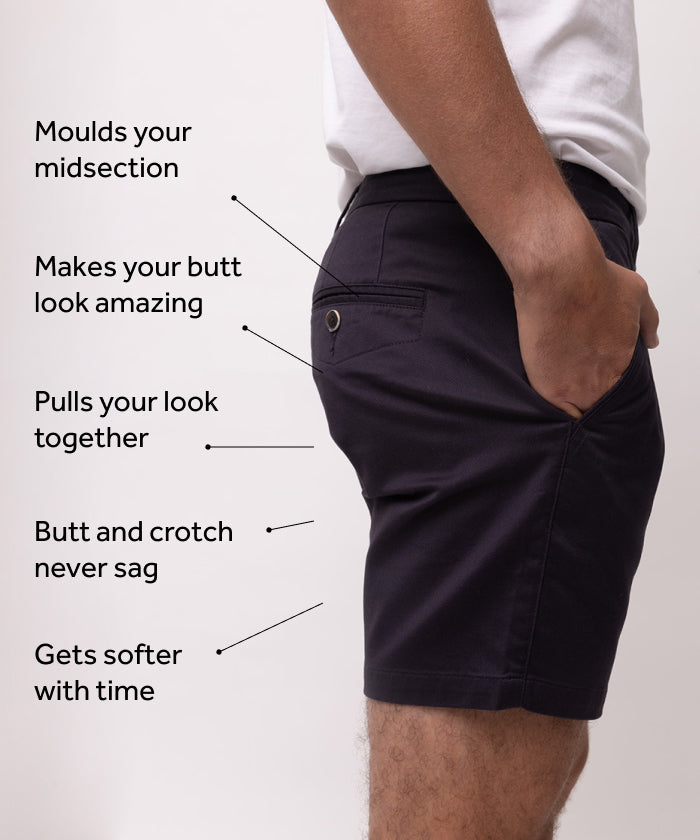 Constructed to be slim on the legs while providing ample room in the crotch area for all-day comfort, our shorts not only enhance your body silhouette but also make you forget you're wearing them. Just like our chinos, they perfect your look, especially by perking up your butt.